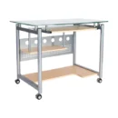 This Techni Mobili rolling computer desk is constructed from safety-tempered frosted glass in a steel frame with a scratch-prevention finish. This contemporary furniture will hold your monitor, keyboard, printer, and CPU. It includes easy-glide casters for easy positioning wherever you desire. The top is made of 10mm safety-tempered frosted glass that is strong enough to hold a computer monitor. The rolling computer desk has a perforated back panel to facilitate wires and cords and keep them from view. The product can be easily assembled with the included mini-screwdriver and wrench. This contemporary computer desk is made of glass and silver-colored metal. Its steel frame has a lead-free powder-coated finish that prevents scratches. The panels and shelves are made of strong engineered wood with a PVC laminate that protects against moisture. The entire desk is on rolling casters that allow for easier movement to other areas of the room, so you can change your space to suit your needs.