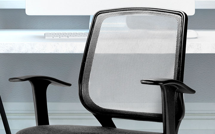 - Contoured back rest elaborated with mesh fabric provides comfort for extended work sessions